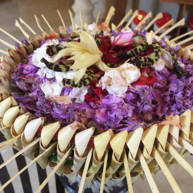 Canang sari is one of the daily offerings made by Balinese Hindus to thank the Sang Hyang Widhi Wasa in praise and prayer. Every home, every business, every place of worship puts of sari multiple times a day. They are little woven grass baskets, filled with flowers, petals and incense.